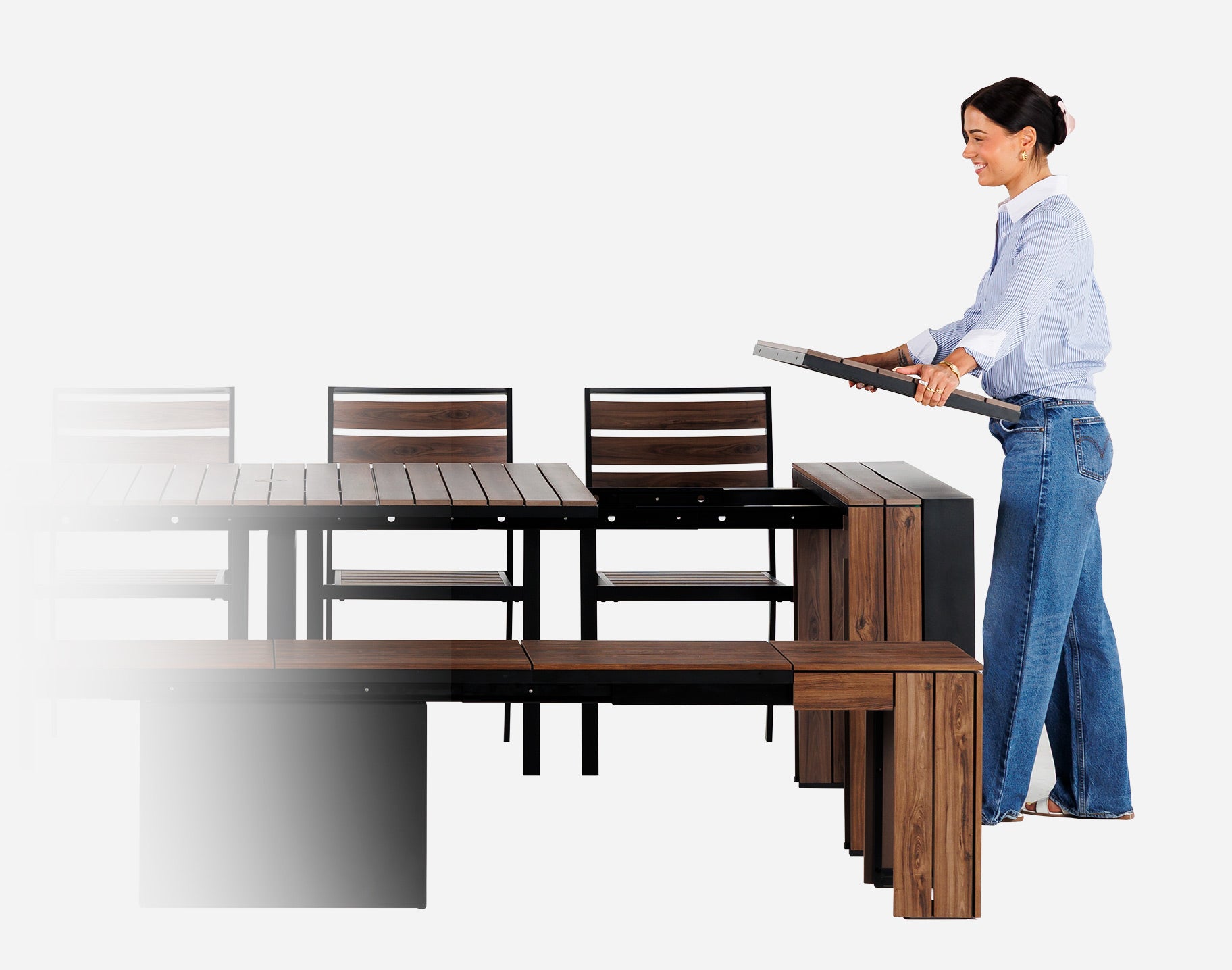 The world's only extendable patio table. A 6-in-1 outdoor dining set that expands to over 9' long. All-weather resistant and made for easy storage, outdoor living has never been easier.