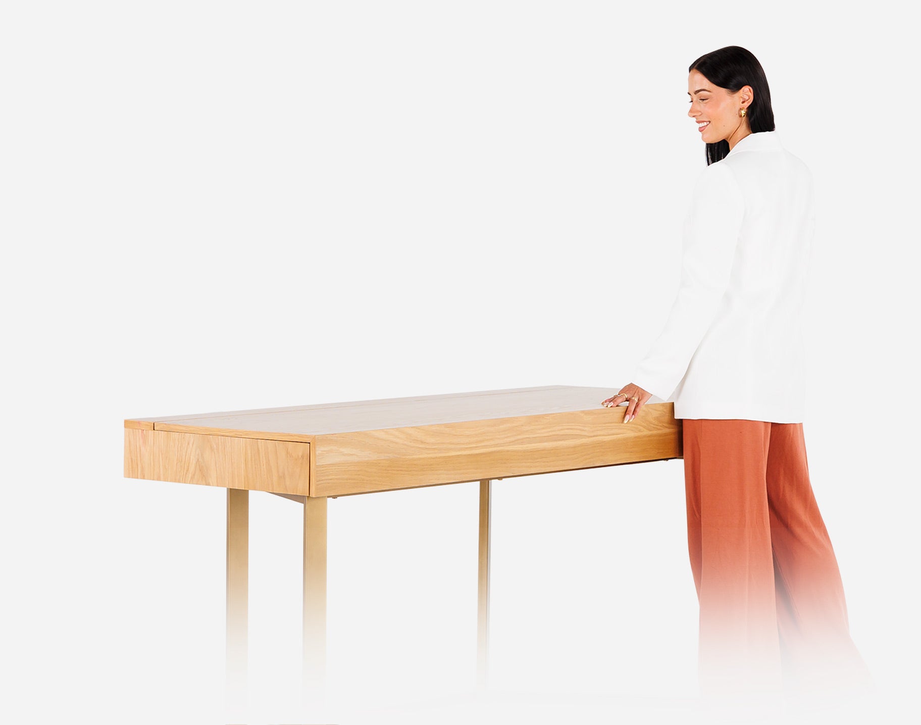 Seamlessly switch from 9-5 to 5-9, with the dining table that becomes two desks. Complete with integrated storage and cable management so work from home doesn't interfere with life at home.