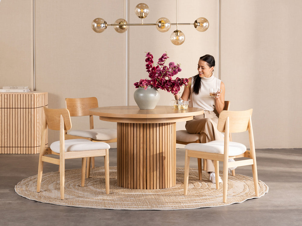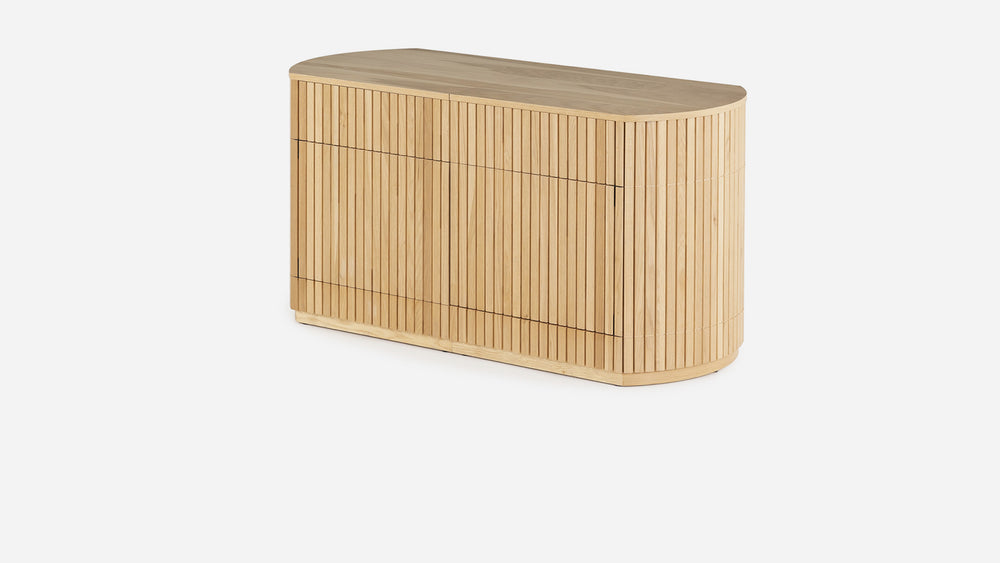 Featuring vertical wooden slats and curved edges, the Transformer Round Sideboard is a thing of beauty. As elegant as it is functional, this buffet table will be a statement piece in any home.
